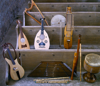 72 Grotta 84 Laute 96 Gotische Harfe 83 Ud 83 Schlüsselfiedel 95 Rahmentrommel 71 Santur, Nay(Rohrflöte) 70 Pommer, Flöten, Dombak